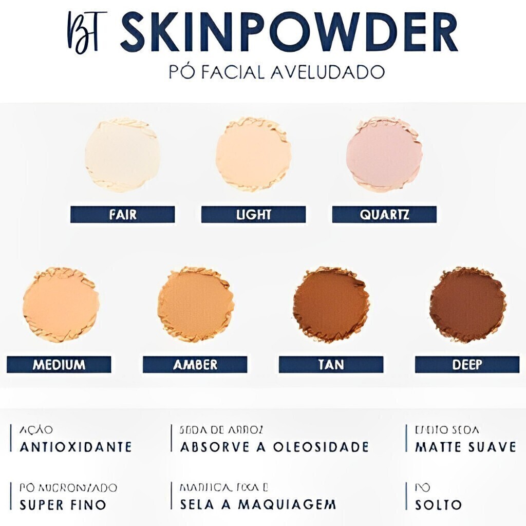 Remova a etiqueta e gire o batoque para liberar a saída do pó. Após a aplicação da base e do corretivo, deposite na pele e espalhe o BT Skinpowder de forma homogênea em todo o rosto, pescoço ou somente nas áreas que deseja selar suavemente a maquiagem. O produto pode ser aplicado com uma esponja ou pincel macio.